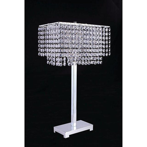 FOA EastRENA Table Lamp, Hanging Crystal, 15"L X 9"W X 27"H, 7.55lbs. Diamond-cut faux crystals, which act as a unique shade, sit atop a metal base, giving...