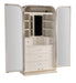One interior wood door with mirrored front and felt-lined storage behind with 22 hooks for hanging necklaces and bracelets and a felt-lined jewelry tray